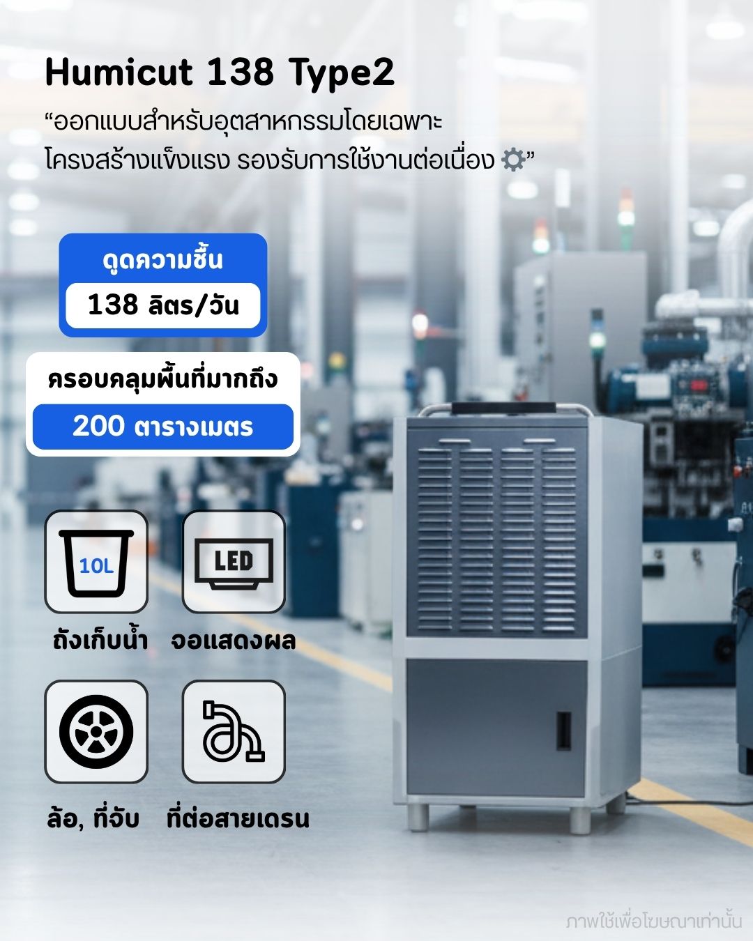 สามารถดูดความชื้นและสกัดน้ำได้ 138 ลิตรต่อวัน พร้อมถังเก็บน้ำ 10 ลิตร ครอบคลุมพื้นที่มากถึง 200 ตร.ม เหมาะสำหรับใช้งานในออฟฟิศ โรงงาน อุตสาหกรรม เพื่อป้องกันการเกิดเชื้อรา ป้องกันการสึกกร่อนที่เกิดจากการขึ้นสนิม และป้องกันการเกาะตัวของน้ำในชั้นใต้ดิน