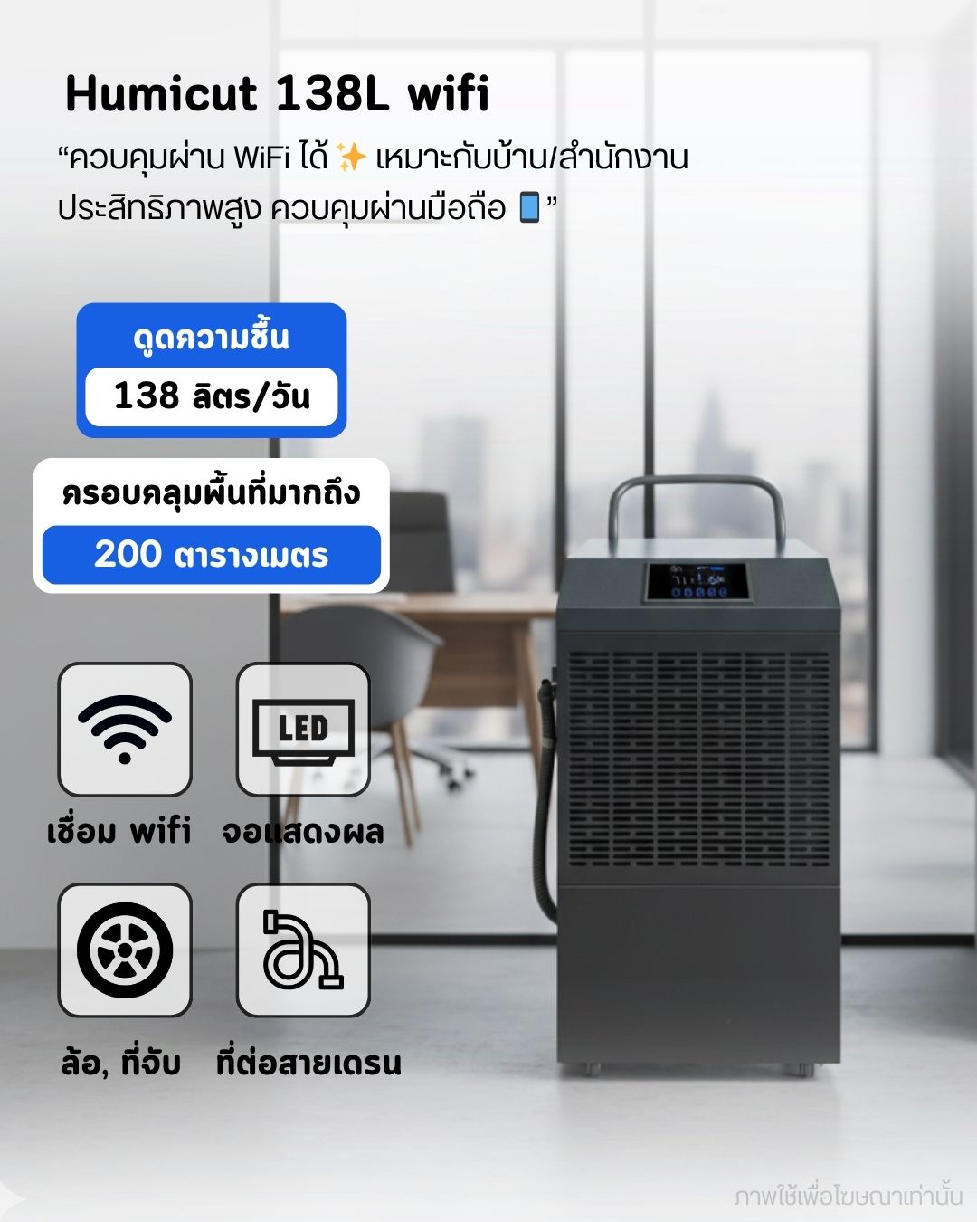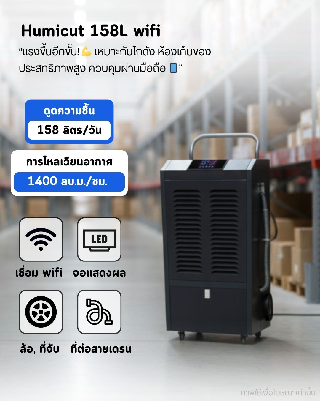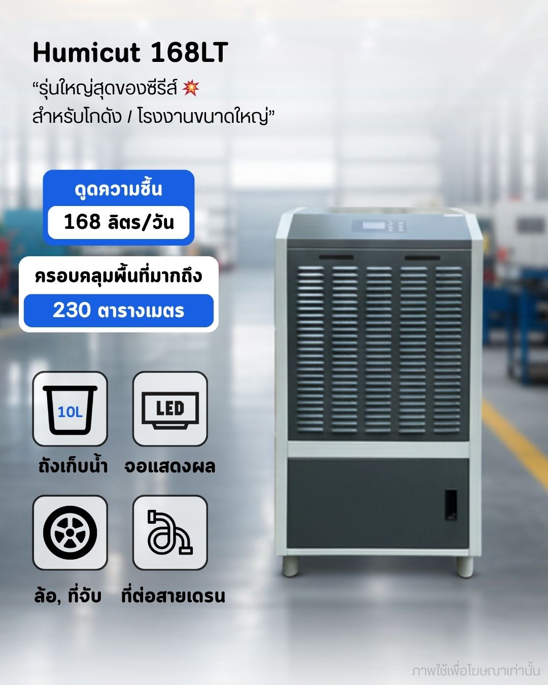 สามารถดูดความชื้นและสกัดน้ำได้ 168 ลิตรต่อวัน ครอบคลุมพื้นที่มากถึง 230 ตร.ม เหมาะสำหรับใช้งานในออฟฟิศ โรงงาน อุตสาหกรรม เพื่อป้องกันการเกิดเชื้อรา ป้องกันการสึกกร่อนที่เกิดจากการขึ้นสนิม และป้องกันการเกาะตัวของน้ำในชั้นใต้ดิน